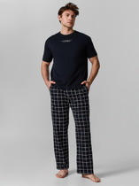 Костюм мужской, состоящий из футболки и брюк. Футболка однотонная с принтом на груди; модель свободная, со спущенной линией плеч, овальным вырезом горловины. Брюки из полотна с набивным рисунком эксклюзивного дизайна, прямые, с боковыми карманами с обтачными входами, на притачном поясе с отстроченной эластичной тесьмой.