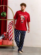 Костюм мужской из трикотажного полотна "кулирка" в комбинации двух видов: гладкокрашеного и набивного с тематическим рисунком, состоящий из футболки и брюк. Футболка из гладкокрашеного полотнас рукавами "реглан" длиной до локтя, горловиной овальной формы, обработанной втачной планкой и отделочной строчкой. В центре переда - принт, выполненгный в технике шелкографии. Брюки из полотна с набивным рисунком длинные, прямые, на притачном поясе с эластичной тесьмой внутри и карманами в боковыых швах.