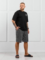 Костюм мужской, состоящий из футболки и шорт. Футболка однотонная с принтом на груди; модель свободная, со спущенной линией плеч, втачными рукавами, овальным вырезом горловины. Шорты из полотна с набивным рисунком эксклюзивного дизайна, с боковыми карманами с обтачными входами, на притачном поясе с отстроченной эластичной тесьмой.