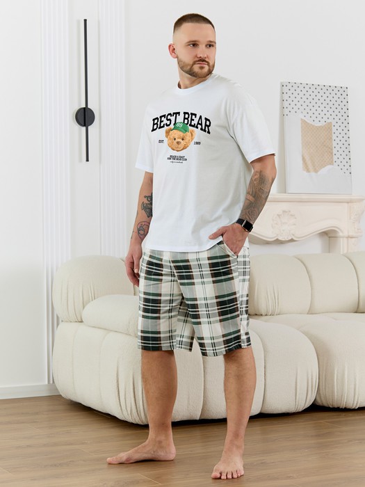 Костюм мужской, состоящий из футболки и шорт. Футболка однотонная с принтом на груди; модель свободная, со спущенной линией плеч, втачными рукавами, овальным вырезом горловины. Шорты из полотна с набивным рисунком эксклюзивного дизайна, с боковыми карманами с обтачными входами, на притачном поясе с отстроченной эластичной тесьмой.