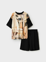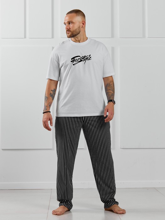 Костюм мужской, состоящий из футболки и брюк. Футболка однотонная с принтом на груди; модель свободная, со спущенной линией плеч. Брюки из полотна с набивным рисунком в узкую черно-белую полоску, прямые, с боковыми карманами с обтачными входами, на притачном поясе с отстроченной эластичной тесьмой.