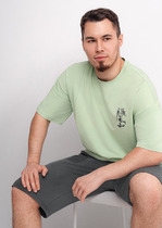 Костюм мужской, состоящий из футболки и шорт. Футболка однотонная с принтом на груди; модель свободная, со спущенной линией плеч, втачными рукавами, овальным вырезом горловины. Шорты из полотна с набивным рисунком эксклюзивного дизайна, с боковыми карманами с обтачными входами, на притачном поясе с отстроченной эластичной тесьмой.