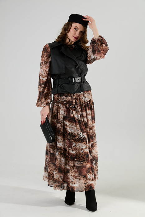 Костюм трехпредметный: состоит из верхнего и нижнего платьев, жилета. Верхнее платье в пол свободного силуэта отрезное по линии бёдер. Перед лифа  имеет расширение по низу. Горловина лифа собрана на сборку, оформлена вырезом по среднему шву и окантована бейкой, переходящей в завязки. Перед лифа цельный, имеет расширение по низу. Юбка платья имеет два яруса, которые собраны на сборку. Рукав объемный, одношовный. Низ рукава собран на сборку. Нижнее платье-комбинация на регулируемых бретелях. Жилет двубортный с отложным воротником на отрезной стойке, умеренного объема, прямого силуэта с застежкой на петли и пуговицы. Талия фиксируется съемным ремнем из экокожи, для которого в боковых швах оформлены шлевки. Ремень идёт в комплекте к изделию.