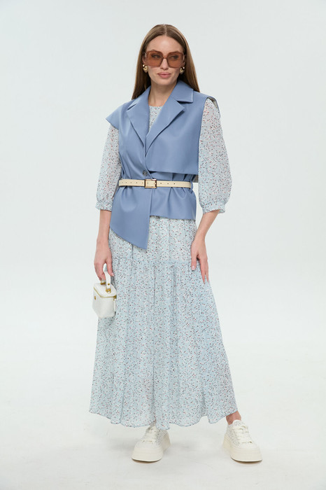Костюм двухпредметный: состоит из платья и жилета. Платье макси прямого свободного силуэта с воланом по низу изделия. Рукав втачной с манжетой. Горловина округлая. Изделие на подкладке. По спинке вырез капелька с застёжкой на пуговицу. Жилет из экокожи прямого силуэта с воротником пиджачного типа. По правой пройме переда расположена фигурная деталь "крылышко". Спинка со средним швом. По низу правого переда и низу правой спинки фигурная деталь. По левой части переда и левой части спинки отлетная кокетка. Изделие идёт в комплекте с ремнем из экокожи.