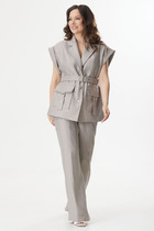 Эффектный костюм из экокожи на хлопковой основе двухпредметный: жилет и брюки. Жилет полуприлегающего силуэта. Горловина и пройма обработана обтачкой. По переду нагрудная вытачка, переходящая в подрез с имитацией кармана. Застёжка на петли-кнопки. Низ асимметричен. По спинке две вытачки и хлястик на резинке. Длина изделия 50 см. Брюки свободного кроя, верхний срез представлен широкой резинкой, с накладными карманами. Длина брюк 101 см.