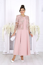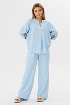 Костюм двухпредметный: состоит из жакета и брюк. Жакет свободного прямого силуэта длиной ниже линии бедер из костюмной ткани. Изделие со съемным поясом, на подкладке и накладными карманами. Рукав втачной, двухшовный, пройма спущена. Воротник английский. Застежка не предусмотрена. Элегантные брюки прямого кроя с боковыми карманами с отрезным бочком. Застежка на молнию и пуговицу. По переду - складки. Задние половинки с талиевыми вытачками и прорезными карманами с листочкой. Верхний срез обработан притачным поясом. Низ обработан швом в подгибку.