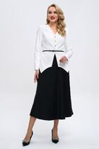 Костюм двухпредметный: состоит из джемпера и брюк. Джемпер комбинированный свободного силуэта с округлой горловиной. Рукав с передними и задними швами. Карманы в боковых швах. Брюки со стрелкой свободного кроя, верхний срез представлен широкой резинкой, с карманами.