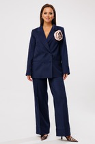 Костюм двухпредметный: состоит из джемпера и брюк. Джемпер свободного силуэта с округлой горловиной. Рукав комбинированного кроя, с передними и задними швами. Верхняя и нижняя часть рукава образуют между собой разрез. Карманы в боковых швах. По переду изделие декорировано фигурным бантом. Брюки со стрелкой свободного кроя, верхний срез представлен широкой резинкой, с карманами.