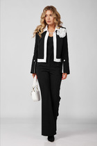 Костюм трехпредметный: состоит из жакета, топа и брюк. Жакет-кардиган свободного прямого силуэта с ассиметричным краем переда без застёжки. По переду два кармана. Воротник  шалевый цельнокроенный. Топ на регулируемых бретелях с полукруглым вырезом. Брюки свободного кроя, верхний срез представлен широкой резинкой, с карманами.
