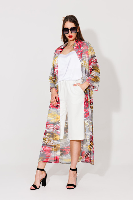 Костюм трехпредметный: состоит из топа, кардигана и шорт.Кардиган прямого кроя  с акцентным принтом. Горловина обработана рубашечным воротником с отрезной стойкой. Модель со слегка приспущенной линией плеча и рукавами длиной 7/8. Застёжка центральная на петли и пуговицы. По низу изделия разрезы. Топ на регулируемых бретелях с полукруглым вырезом. Удлиненные шорты прямого кроя, верхний срез представлен широкой резинкой, с карманами.