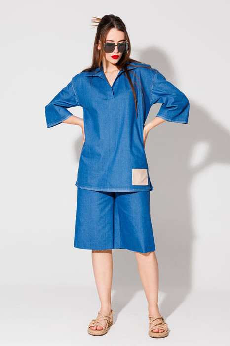 Костюм двухпредметный: состоит из блузы и шорт. Блуза прямого силуэта свободного кроя с втачным рукавом со спущенной проймой. По горловине переда планка с запахом. Воротник с цельнокроенной стойкой. По низу переда имеется нашивка из экокожи. Боковые швы с разрезами. Удлиненные шорты прямого кроя, верхний срез представлен широкой резинкой, с карманами. Низ изделия не обработан.