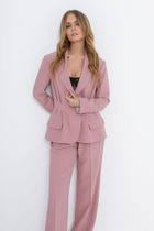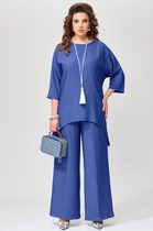 Костюм трехпредметный: состоит из брюк и жакета, галстука.  Жакет прямого силуэта на подкладке. Спинка со средним швом. На полочке нагрудная вытачка переведена в прорезной карман с клапаном и листочкой. Линия плеч расширена. Рукава втачные, длинные, двухшовные. Воротник отложной, пиджачного типа на отрезной стойке. Однобортная застежка на петли и пуговицы. Отделочные детали из трикотажного гофре по низу рукава и самого изделия создают имитацию рубашки.  Брюки прямого кроя, с карманами.По переду боковой карман, застежка на тесьму-молнию и пуговицу. По спинке верхний срез  представлен резинкой. Галстук классический на резинке станет отличным дополнением к комплекту.