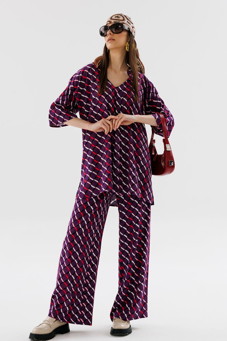 Костюм двухпредметный: состоит из блузы и брюк. Элегантная блуза с V-образным вырезом горловины и воротником стойкой, без застёжки. Спинка и полочка цельные, на полочке заложена односторонняя складка. Линия плеча приспущенаи. Рукав три четверти со складками. Брюки  свободного кроя c карманами, верхний срез представлен широкой резинкой.