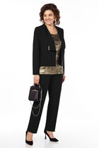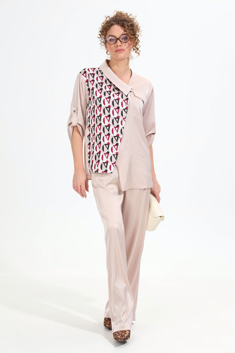 Костюм двухпредметный: состоит из жакета и брюк. Жакет рубашечного типа прямого силуэта с асимметричным низом. Рукав втачной со спущенной линией плеча, фиксируется на пату. Застежка центральная на петли и пуговицы, смещённая по косой. На левой полочке накладной карман с клапаном. Воротник отложной на стойке до половины спинки. Брюки свободного кроя из гладкой ткани сочетают элегантность и комфорт. Широкая резинка на поясе и наличие функциональных карманов подчеркивают удобство модели.