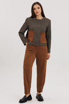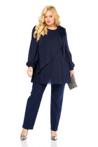 Костюм комбинированный двухпредметный: состоит из жакета и юбки. Жакет рубашечного типа прямого силуэта с асимметричным низом. Рукав втачной со спущенной линией плеча, фиксируется на пату. Застежка центральная на петли и пуговицы, смещённая по косой. На левой полочке накладной карман с клапаном. Воротник отложной на стойке до половины спинки. Юбка - солнце макси с узким поясом. В боковых швах расположены карманы. Застёжка на петлю и пуговицу и молнию по спинке.