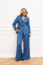 Костюм двухпредметный: состоит из жакета и юбки. Жакет прямого силуэта с имитацией центральной застёжки на пуговицы. Рукав втачной одношовный, длиной три четверти,застегивающийся на пату. Воротник пиджачного типа . Линия низа фигурная, симметричная . По левому переду расположена декоративная деталь. Юбка длиной миди, расклешенная к низу, с асимметричным низом. Пояс притачной, по спинке собран на резинку. Переднее полотнище состоит из трех частей. Правая часть скреплена отделочной строчкой и кнопками. В боковых швах изделия расположены карманы. По спинке изделия идёт средний шов и две вытачки для удачной посадки по фигуре. Юбка без подкладки.