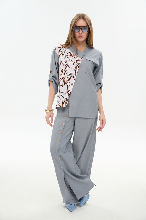 Костюм двухпредметный: состоит из жакета и юбки. Жакет рубашечного типа прямого силуэта с асимметричным низом. Рукав втачной со спущенной линией плеча, фиксируется на пату. Застежка центральная на петли и пуговицы, смещённая по косой. Воротник отложной на стойке до половины спинки. Брюки свободного кроя, верхний срез представлен широкой резинкой, с карманами. По центру правой брючины расположена планка с функционирующими петлями и пуговицами.