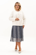 Юбка классическая, с посадкой на талии, двухслойная: верхний слой из гипюра, нижний из "сатина", на притачном поясе, застегивающимся на 1 петлю и 1 пуговицу. Переднее и заднее полотнища с талиевыми вытачками в нижних слоях. Застежка на потайную тесьму-"молнию" расположена в левом боковом шве. Для лучшего прилегания юбки в области талии в поясе частично по заднему полотнищу вставлена резинка. Низ юбки из гипюра оформлен фестонами.