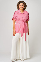 Блузка полуприлегающего силуэта, выполнена из трикотажного полотна «масло». Модель без плечевых накладок. Горловина округлой формы, спереди оформлена фигурным вырезом и отрезной бейкой. Рукав короткий, втачной. Длина блузки – 63 см; длина рукава – 23 см.