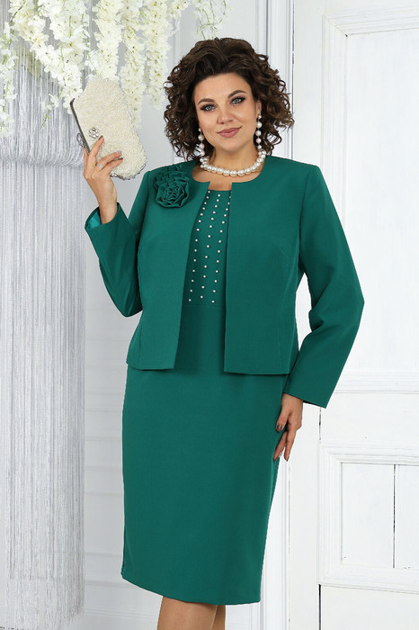 Комплект женский, 2-х предметный, состоящий из жакета и платья. Жакет полуприлегающего силуэта, выполнен из костюмно-плательной ткани. Модель на подкладке, с плечевыми накладками. Перед с рельефными швами, выходящими из пройм до низа и нагрудными вытачками, направленными от рельефов к центру груди. Борта прямые, без застежки, не доходят до центра переда. Спинка со средним швом и рельефами, идущими от плеча до низа. Горловина округлой формой, спереди углубленная. Рукав втачной, длинный. Жакет декорирован несъемным «цветком» из основной ткани. Длина жакета – 56 см; длина рукава – 60 см. Платье полуприлегающего силуэта, выполнено из костюмно-плательной ткани. Модель на трикотажной подкладке, с плечевыми накладками. Перед отрезной по линии талии. Верхняя часть с нагрудными вытачками, идущими из пройм и двумя вертикальными подрезами по центру. В нижней части расположены талиевые вытачки, выходящие из подреза. Горловина и вставка лифа переда декорированы пришивными перламутровыми бусинами. Спинка с талиевыми вытачками и средним швом, в верхней части которого обработана застежка на потайную тесьму-«молнию» (50см), а в нижней - шлица. Горловина округлой формы, по переду углубленная. Рукав втачной, длиной 3/4. Длина платья – 106 см; длина рукава – 40 см.