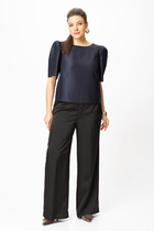 Брюки классические, длинные, с посадкой на талии, выполнены из крэш-полотна. Модель без стрелок. Передние и задние половинки брюк с талиевыми вытачками, направленными от пояса вниз. Спереди обработаны наклонные боковые карманы и центральная застёжка на тесьму-«молнию». Притачной пояс застегивается на 1 петлю и 1 пуговицу; для лучшего прилегания по линии талии в притачном поясе предусмотрена эластичная лента, вставленная по спинке. Длина брюк по боковому (с поясом) -- 108 см.