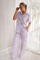 Элегантный комплект, состоящий из брюк и рубашки. Рубашка прямого силуэта, умеренная по объему, длиной до середины бедер. Центральная бортовая застежка на петли и пуговицы. Воротник рубашечный. Спущенная линия плеча. Свободный короткий рукав. Спинка прямая. Изделие без подкладки. Брюки прямые, свободного кроя, без подкладки. Пояс на резинке (без застежки). Карманы в боковых швах.