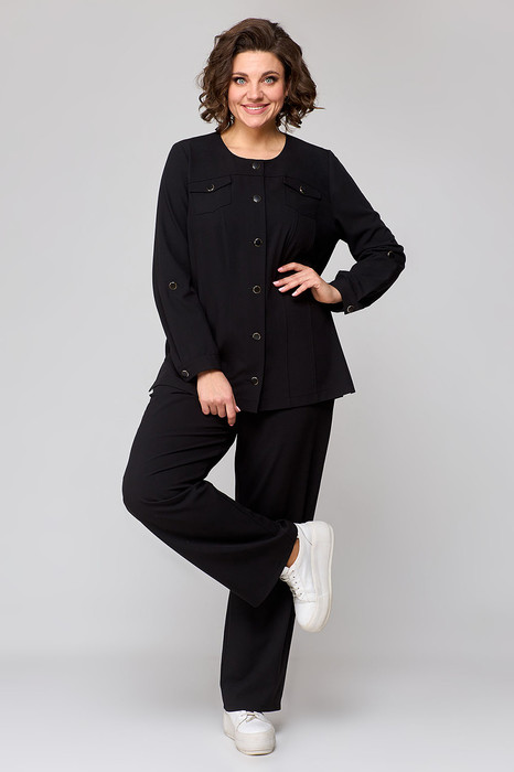 Стильный двух предметный  костюм для женщин из костюмной  ткани «гальяно» - это идеальное сочетание комфорта и элегантности. Такой  костюм подходит как для офисного делового образа, так и для повседневного ношения. Жакет костюма выполнен в классическом стиле на пуговицах, без воротника с накладными карманами. Рукав длинный на манжете с патой на петлю и пуговицу. По боковым швам обработаны разрезы. Брюки костюма имеют прямой крой в стиле палаццо, что позволяет создать строгий и элегантный образ. Карманы на брюках расположены по бокам, что добавляет практичности и функциональности. Пояс брюк на резинке. Этот костюм не только обеспечит вам ощущение комфорта в любой ситуации, но также придаст изящности и женственности вашему образу. Если к костюму  добавить из Вашего  гардероба белую нарядную блузу-  получится нарядный комплект.