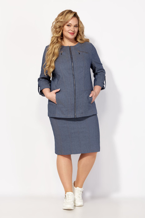 Джинсовый классический женский костюм с жакетом и юбкой. Легкая высококачественная ткань, в составе которой хлопок и полиэстер, делает изделие прочным и долговечным. Элегантная юбка со шлицей сзади имеет полуприлегающий силуэт. По юбке и жакету  выполнены отделочные строчки на двухигольной машине. Жакет прямого силуэта, с округлой горловиной и функциональной застежкой на молнию по центру; на уровне груди выполнены карманы-обманки с молнией, а в рельефе на уровне талии - функциональные карманы. Этот джинсовый жакет Вы можете надеть как на платье, так и под брюки, что позволяет создать несколько образов. Также юбку можно скомбинировать с блузой, джемпером или майкой.Стильный костюм подчеркнёт Вашу фигуру, подойдет как для высоких, так и для невысоких женщин. Костюм сделает Ваш образ модным и элегантным. В этом костюме Вы будете выглядеть безупречно как на дне рождения, так и на работе.