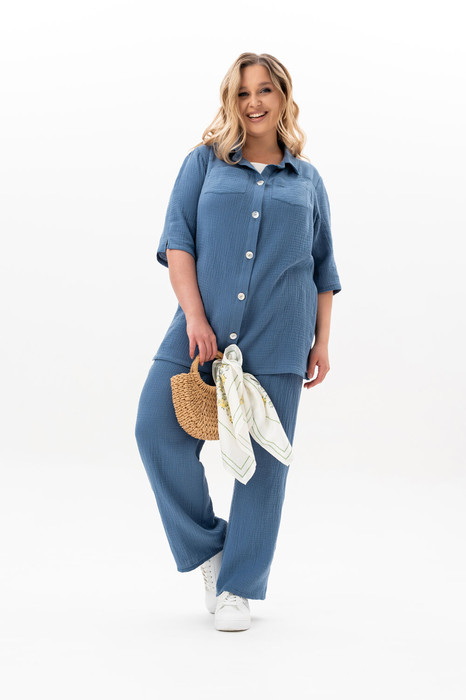 Ищете идеальный костюм, который сочетает в себе комфорт и стиль? Обратите внимание на наш женский брючный костюм из муслиновой ткани! Этот комплект станет Вашим незаменимым спутником как для домашнего отдыха, так и для прогулок на свежем воздухе. Изготовленный из 100% хлопка, он обеспечивает отличную воздухопроницаемость и легкость, что особенно актуально в жаркие летние дни. Муслин — это дышащий материал, который быстро сохнет, что делает его идеальным выбором для активных женщин. Вы сможете не беспокоиться о стирке, ведь этот комплект легко стирать и он не требует особого ухода. Костюм представлен в универсальном дизайне, который подойдет для любого повода. Стильный, яркий цвет добавит яркости в Ваш гардероб. Брюки на резинке с карманами-хулиганами в боковых швах. Силуэт брюк прямой. Рубашка дополнена накладными карманами по переду и кокетками на спинке и полочке. Перед и спинка рубашки - разноуровневые. Рукав с увеличенной линией плеча, длиной до локтя и с небольшими разрезами. На полочке пришиты пуговицы из натуральной ракушки.