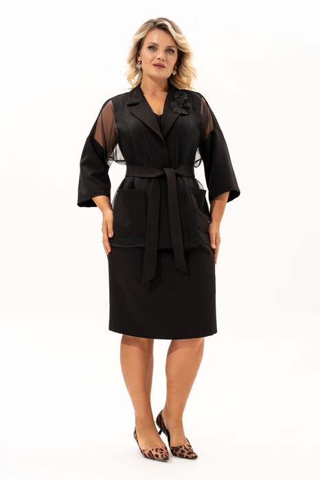 Невероятно нарядный   женский комплект - двойка ALGRANDA: жакет и платье - это стильное и  комфортное решение для женщин больших размеров, которые ценят комфорт и стиль.  Жакет скомбинирован из двух тканей- барби и органзы, что  делает изюминку в этом шикарном   комплекте. Прочный, мягкий и несминаемый комплект выглядит красиво, делая образ женственным , соблазнительным . Жакет без застежки, с функциональными карманами и спущенным плечом. Пояс, входящий в комплект, позволяет акцентировать талию и придать жакету дополнительный шик. Свободный крой жакета  придаёт ему особую изысканность, идеально подобранные строчки делают его ещё более эффектным. Жакет оснащён аккуратным английским воротником .  В комплекте  к  жакету идёт платье полуприлегающего силуэта.  Горловина платья V-образной формы, что очень красиво подчеркивает грудь .  Спинка со средним швом , талиевыми выточками и шлицей. Универсальное и практичное платье длиной ниже колена.   На передней полочке платья от плеча расположены рельефы. В левом боковом шве платья есть молния.   Это  платье очень красиво смотрится в сочетании с жакетом, но можно носить и как самостоятельное изделие. В этом комплекте вы будете выглядеть безупречно! Отличный вариант для нарядного  и вечернего гардероба, а также и просто для повседневного применения. Грация, изящество, утончённые  декоративные элементы делают этот комплект уникальным. Многослойность сегодня – популярный тренд моды. Это позволяет женщинам экспериментировать и создавать множество стильных аутфитов на свой вкус.Такой элегантный  комплект впишется в любое мероприятие: начиная от свадьбы, дня рождения, романтического свидания, заканчивая новогодней вечеринкой.