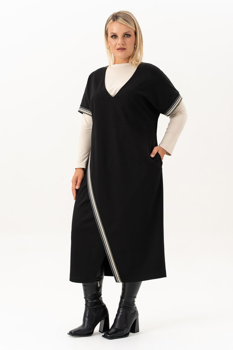 Для офиса и для прогулок, для деловой встречи, корпоратива и даже для школы - этот сарафан свободного покроя подойдет для любого случая. Модель дополнена базовой футболкой с длинным рукавом, Ваш стильный повседневный образ готов! Этот женский офисный сарафан выполнен из трикотажного полотна «Лакоста» - удобного и приятного к телу материала с основой из вискозы , в котором будет комфортно, ткань хорошо держит форму и отличается устойчивостью к износу. Разрез по переду изделия и проймы обработаны декоративной тесьмой. В левом боковом шве обработан карман, линия плеча спущена. Лонгслив выполнен из трикотажного полотна «Кулирка» на основе хлопка. Мы сшили эту модель в больших размерах, чтобы ее могли подобрать для себя обладательницы пышных форм. Этот наряд отлично впишется в строгий образ деловой дамы. Стильный сарафан элегантно впишется в нарядный и повседневный образ. Он подойдет как для любого праздничного мероприятия, так и на каждый день .