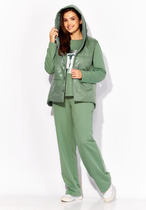 Блузон свободной формы «оверсайз» со спущенным плечом выполнен из трикотажного полотна. Горловина округлой формы обработана планкой. Перед и спинка цельные по низу с планкой и с разрезом по переду. Рукава с планками и с разрезами по линии локтя, по низу – на манжете и слегка присборены. На детали переда расположена печать в цвет брюк.