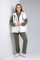 Жакет укороченный, со спущенным плечом, с застежкой на отделочную молнию. Воротник пиджачного типа. Рукав длинный, низ рукава на манжете с резинкой. На спинке горизонтальная кокетка. На полочке накладные карманы с клапаном. Карман состоит из двух частей, шов является входом в карман. Горловина оформлена стояче-отложным воротником. По низу пояс притачной, собранный на резинку. Отделочные строчки выполнены нитками в цвет воротника.