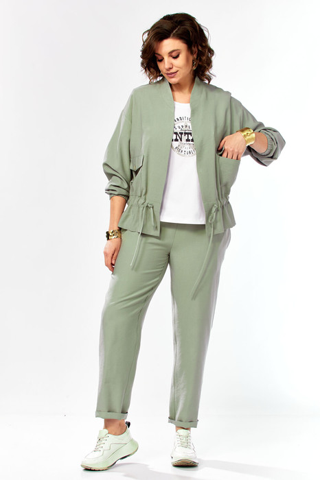 Комплект женский: жакет, блузка, брюки. Жакет со спущенным рукавом, центральной застежкой на магниты и воротником стойкой. На переде обработаны накладные карманы с клапанами. По спинке отрезная кокетка. По низу кулиса по талии. Длинный рукав, на резинке. Брюки заужены к низу с карманами в боковых швах. Верхний срез брюк на поясе частично на резинке. Блузка с округлым вырезом горловины, коротким рукавом и термоаппликацией по переду.