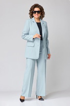 Костюм женский спорт-шик. Джемпер прямого силуэта, со спущенным рукавом. Воротник-стойка из отделочной ткани, планка по центру, в которой вставлена молния, декаротивная нашивка. Рукав с планками из отделочной ткани и декоративные защипы на манжетах. По низу кулиска с фиксаторами. Брюки прямые, по переду застрочены стрелки, по внешней стороне отделочные детали с разрезами по низу. Карманы в боковых швах, пояс на резинке.