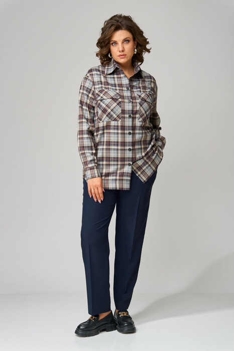 Рубашка свободной формы, покроя спущенное плечо, с центрально-бортовой застежкой на петли-пуговицы (цельнокроеная планка). Горловина оформлена стояче-отложным воротником с отрезной стойкой. Рукав двушовный, низ оформлен манжетой, застегивающейся на пуговицу. В боковых швах расположены небольшие разрезы закругленной формы. На спинке расположена горизонтальная кокетка, на нижней части спинки заложена встречная складка. На переде расположены накладные карманы с клапанами.