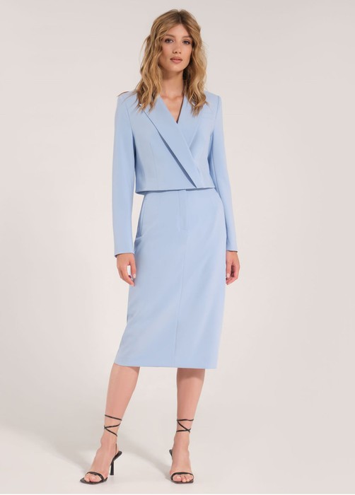 Элегантный офисный костюм послужит вам для создания стильных образов. Его уместно надеть на работу, учебу, деловую встречу, конференцию, бизнес-ланч. Модель изготовлена из плотной поливискозной ткани. Укороченный жакет и юбка-карандаш длиной ниже колена скроены в прямом силуэте, отлично садятся по фигуре. Пиджак с английским воротником и нагрудным карманом подчеркивает официальный стиль комплекта. Юбка с молнией в гульфике дополнена карманами-обманками.