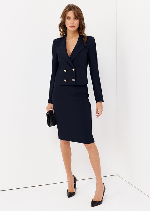 Стильный женский костюм с жакетом и юбкой решит вопрос с созданием образов в официальном стиле. Трикотажный костюм женский хорошо подойдет для прохладного лета и межсезонья. Укороченный жакет с двубортным воротником украшен четырьмя пуговицами, по две в ряд. Дополняет его прямая юбка длиной до колена. Костюм пиджак и юбка женские можно носить самостоятельно или сочетать с майками, футболками, блузками. Для завершения строгих образом подойдут туфли-лодочки на каблуке. Закажите классический юбочный костюм по выгодной цене уже сегодня.