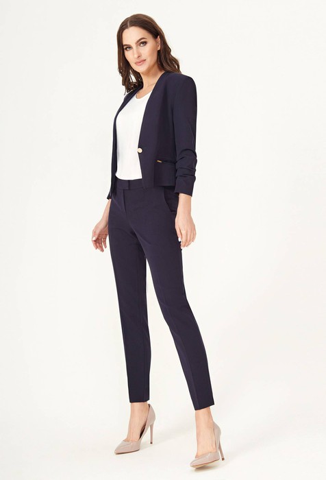 Стильный лаконичный брючный костюм. Жакет с застежкой на одну пуговицу. Жакет полуприлегающего силуэта, с V-образным вырезом горловины. По переду и по спинки имеются вытачки и рельефы, которые обеспечивают отличную посадку изделия по фигуре. Рукава втачные, длиной 3/4. Брюки классические на поясе, укороченые, с карманами по переду. Отличный вариант как для деловых встреч, так и для торжественных мероприятий.