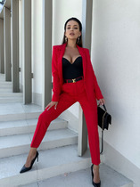 Детали: жакет полуприлегающего силуэта, талиевые вытачки, пиджачный воротник, застежка на две петли и пуговицы, функциональные карманы, рукава и спинка со шлицами, жакет на подкладке из 100% вискозы. Брюки с высокой посадкой, притачной пояс со шлевками, задняя часть пояса эластичная- с резинкой, застежка на молнию и пуговицу, боковые карманы, передние половины с двумя складками