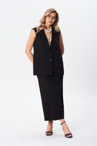 Детали: жакет прямого силуэта, пиджачный воротник, перед с прорезными карманами, двубортная застежка на петли и пуговицы, спинка со средним швом, рукава втачные двухшовные, жакет на подкладке. Брюки с высокой посадкой на притачном поясе со шлевками, застежка на молнию и пуговицу, боковые карманы, передние половины с заутюженными стрелками и двумя небольшими складками