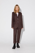 Текстильный комплект-тройка из классического полуприлегающего жакета, базовой трикотажной майки и широких прямых брюк. Детали: жакет полуприлегающего силуэта, талиевые вытачки, пиджачный воротник, застежка на две петли и пуговицы, функциональные карманы, жакет на подкладке. Майка из трикотажа- «лапша», глубокие вырезы горловины и пройм. Брюки с высокой посадкой на притачном поясе со шлевками, застежка на молнию и пуговицу, боковые карманы, передние половины с заутюженными стрелками и двумя небольшими складками.