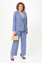 Текстильный костюм-двойка из двубортного полуприлегающего жакета и прямых брюк со стрелками. Детали: жакет с отрезными бочками и нагрудными вытачками, пиджачный воротник, прорезные карманы, застежка на петли и пуговицы, спинка со средним швом, втачные двухшовные рукава, жакет на подкладке. Брюки с высокой посадкой на притачном поясе со шлевками, передние половины с небольшими застроченными мягкими складками и заутюженными стрелками, застежка на молнию и пуговицу, боковые карманы.