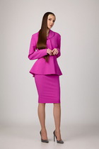 Текстильный костюм-двойка из двубортного полуприлегающего жакета и прямых брюк со стрелками. Детали: жакет с отрезными бочками и нагрудными вытачками, пиджачный воротник, прорезные карманы, застежка на петли и пуговицы, спинка со средним швом, втачные двухшовные рукава, жакет на подкладке. Брюки с высокой посадкой на притачном поясе со шлевками, передние половины с небольшими застроченными мягкими складками и заутюженными стрелками, застежка на молнию и пуговицу, боковые карманы.