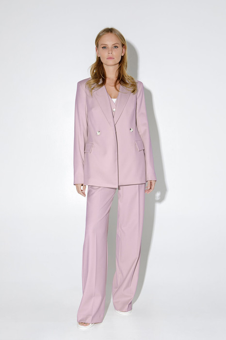 Текстильный костюм-тройка из двубортного полуприлегающего жакета, жилета и прямых брюк со стрелками. Детали: жакет с отрезными бочками и нагрудными вытачками, пиджачный воротник, прорезные карманы, застежка на петли и пуговицы, спинка со средним швом, втачные двухшовные рукава, жакет на подкладке. Жилет полуприлегающего силуэта, талиевые вытачками, застежка на петли и пуговицы, функциональные карманы, фигурный низ, на подкладке. Брюки с высокой посадкой на притачном поясе со шлевками, передние половины с небольшими застроченными мягкими складками и заутюженными стрелками, застежка на молнию и пуговицу, боковые карманы.