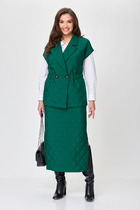 Текстильный костюм-тройка из двубортного полуприлегающего жакета, жилета и прямых брюк со стрелками. Детали: жакет с отрезными бочками и нагрудными вытачками, пиджачный воротник, прорезные карманы, застежка на петли и пуговицы, спинка со средним швом, втачные двухшовные рукава, жакет на подкладке. Жилет полуприлегающего силуэта, талиевые вытачками, застежка на петли и пуговицы, функциональные карманы, фигурный низ, на подкладке. Брюки с высокой посадкой на притачном поясе со шлевками, передние половины с небольшими застроченными мягкими складками и заутюженными стрелками, застежка на молнию и пуговицу, боковые карманы.