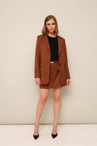 Костюм-двойка из укороченного жакета и мини-юбки с высокой посадкой из фактурной костюмной ткани. Детали: жакет полуприлегающего силуэта, рельефы, круглая горловина, без воротника, рукава втачные со складками по окату, функциональные карманы, застежка на петли и пуговицы, на подкладке. Юбка на притачном поясе, застежка сзади на потайную молнию, юбка на подкладке.