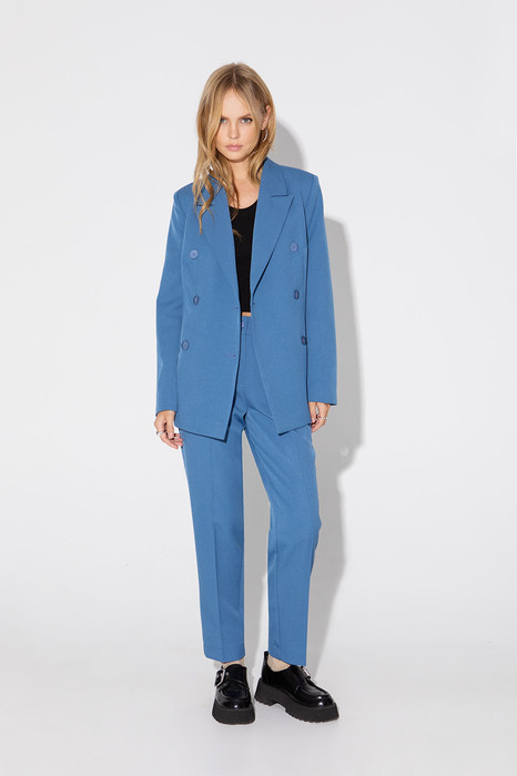 Классический костюм-двойка из двубортного жакета и укороченных брюк со стрелками.