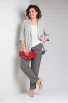 Длина жакета по спинке около 66 см в размерах 40-46 и около 69 см в размерах 48-52, длина рукавов около 61 см. Длина брюк по боковому шву с поясом около 97 в размерах 40-46 и около 98,5 см в размерах 48-52, длина по внутреннему шву около 70 см.