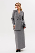 Детали: жакет полуприлегающего силуэта, пиджачный воротник, перед с прорезными карманами, двубортная застежка на петли и пуговицы, спинка со средним швом, рукава втачные двухшовные, жакет на подкладке. Брюки со средней посадкой, притачной пояс со шлевками, передние половины с небольшими мягкими складками и заутюженными стрелками, застежка на молнию и пуговицу, боковые карманы.